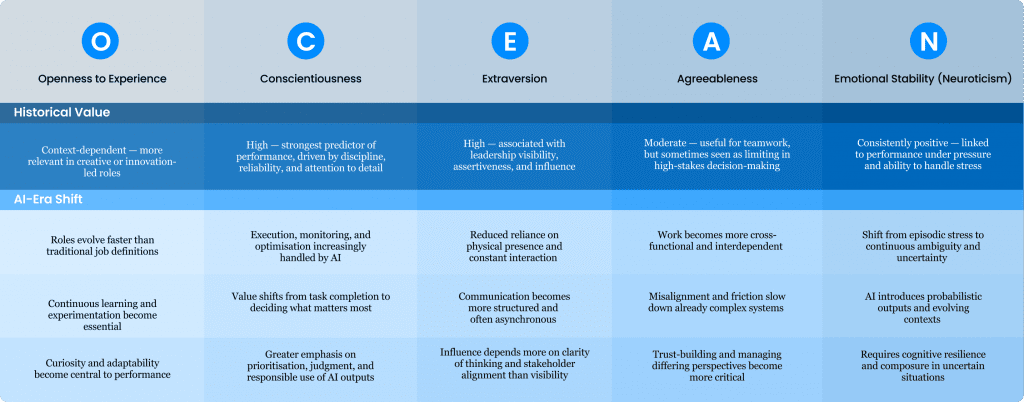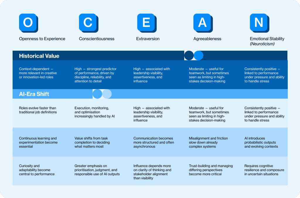 Traditional personality frameworks may underweight traits that are becoming more relevant in AImediated work. These include learning orientation, metacognitive awareness, ethical sensitivity, and systems thinking.